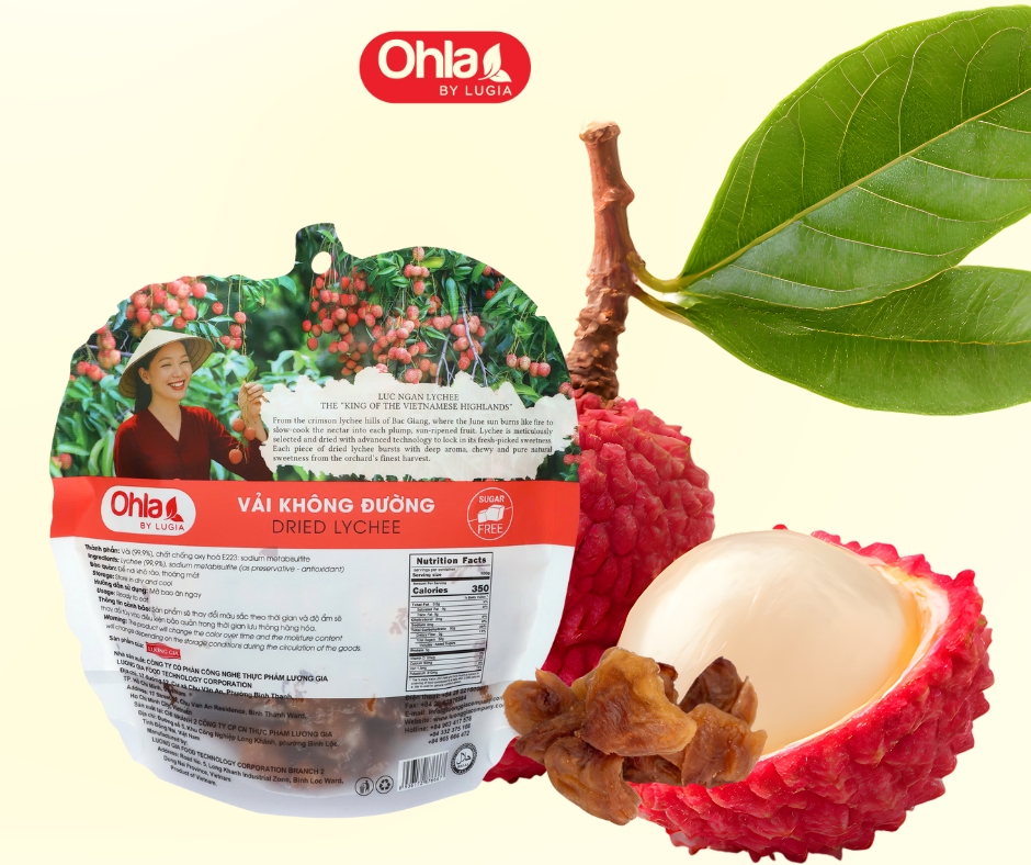 Ohla là sản phẩm thuộc thương hiệu Lương Gia, chuyên cung cấp các dòng trái cây sấy dẻo như xoài, mít, thanh long, chuối, vải… với đa dạng hương vị và hình thức đóng gói tiện lợi. Trong đó, vải sấy dẻo không đường Ohla là một trong những sản phẩm bán chạy nhất, được người tiêu dùng ưa chuộng nhờ vị ngọt thanh và mùi thơm tự nhiên đặc trưng.
