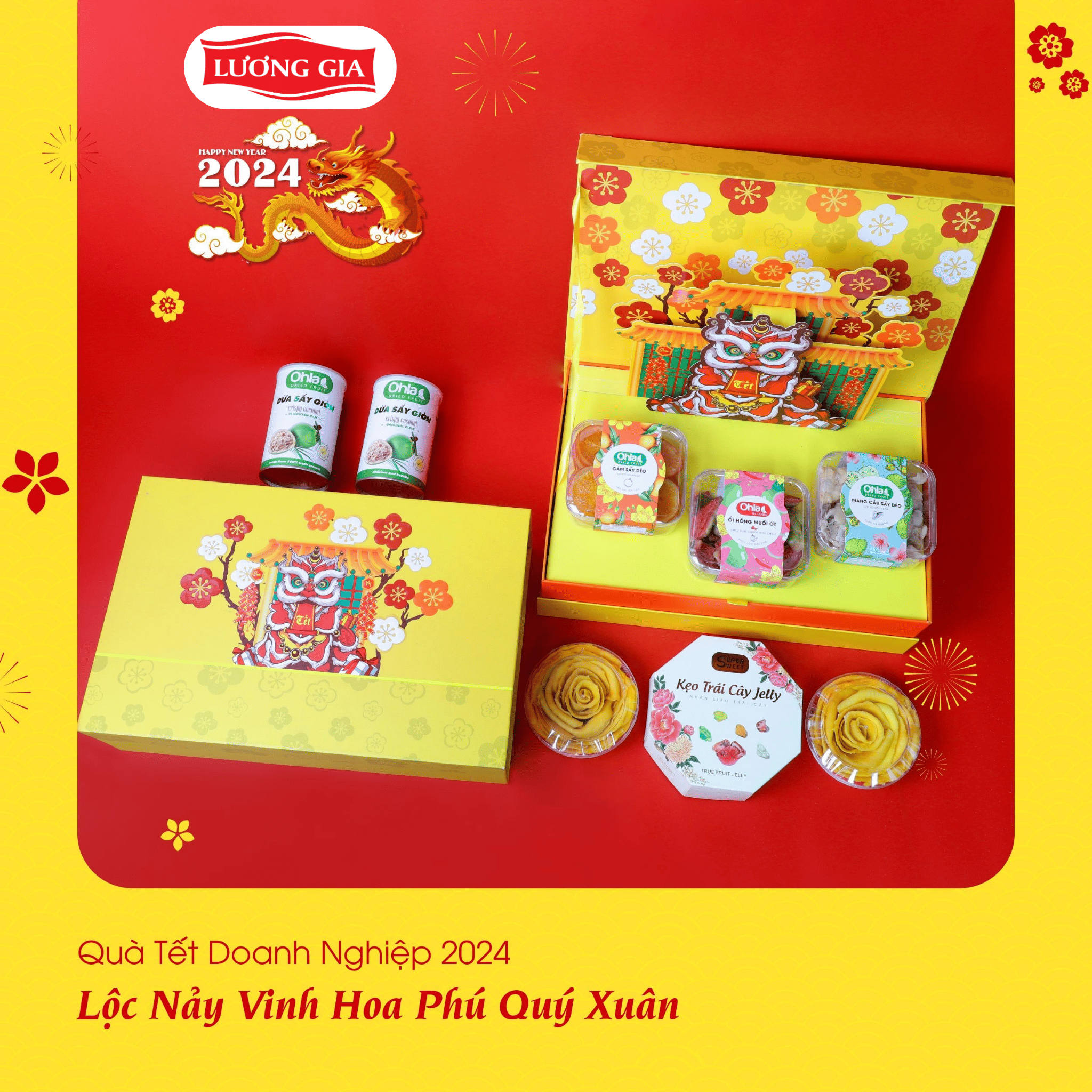 Hộp quà Tết Ohla Lấy cảm hứng từ loại hình văn hóa nghệ thuật múa “Lân – Sư – Rồng”, hộp quà tặng được thiết kế cao cấp và đẹp mắt cùng với những sản phẩm chú trọng đến sức khỏe, rất phù hợp để dùng làm quà tặng dành cho đối tác, gia đình và bạn bè.